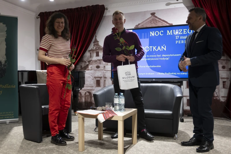 Następnie o Wandzie i Teodorze Modzelewskich opowiadali Jarosław Kurski – dziennikarz, autor książki „Dziady i dybuki”, wnuk Teodory Modzelewskiej oraz Anna Czachorowska – kustoszka Muzeum Warmii i Mazur w Olsztynie, autorka publikacji o tkaninach ludowych, opiekunka kolekcji Teodory Modzelewskiej.