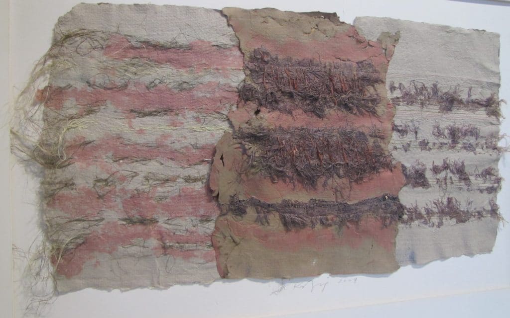 Tak Artystka opowiada o swoim procesie twórczym: – Na wyczerpanym arkuszu papieru, który pozostaje na sicie, układam kompozycję – kolaż z różnych materiałów i częściowo pokrywam ją masą papierową dla połączenia z podłożem. Po jej wysuszeniu powstaje jednorodna płaszczyzna.